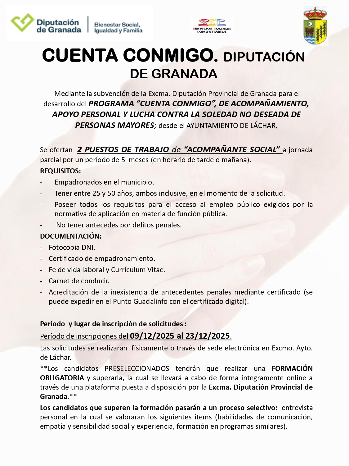 INSCRIPCIONES EN LAS OFICINAS MUNICIPALES DEL AYUNTAMIENTO DE LACHAR: del 09/12/2025 al 23/12/2025